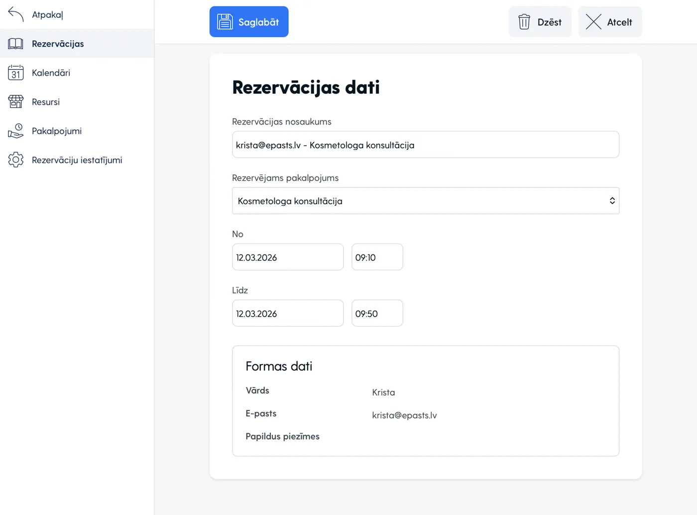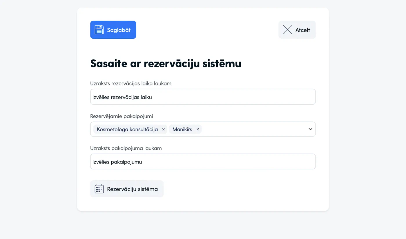 - Sasaiste ar pieteikuma formām: Tu vari savienot rezervācijas ar pieteikuma formām tavā mājaslapā. Klients ne tikai izvēlas pakalpojumu un laiku, bet vienā plūstošā solī var aprakstīt savu vajadzību, atstāt komentārus vai norādīt īpašas vēlmes.