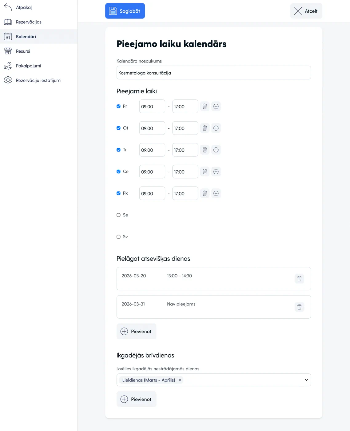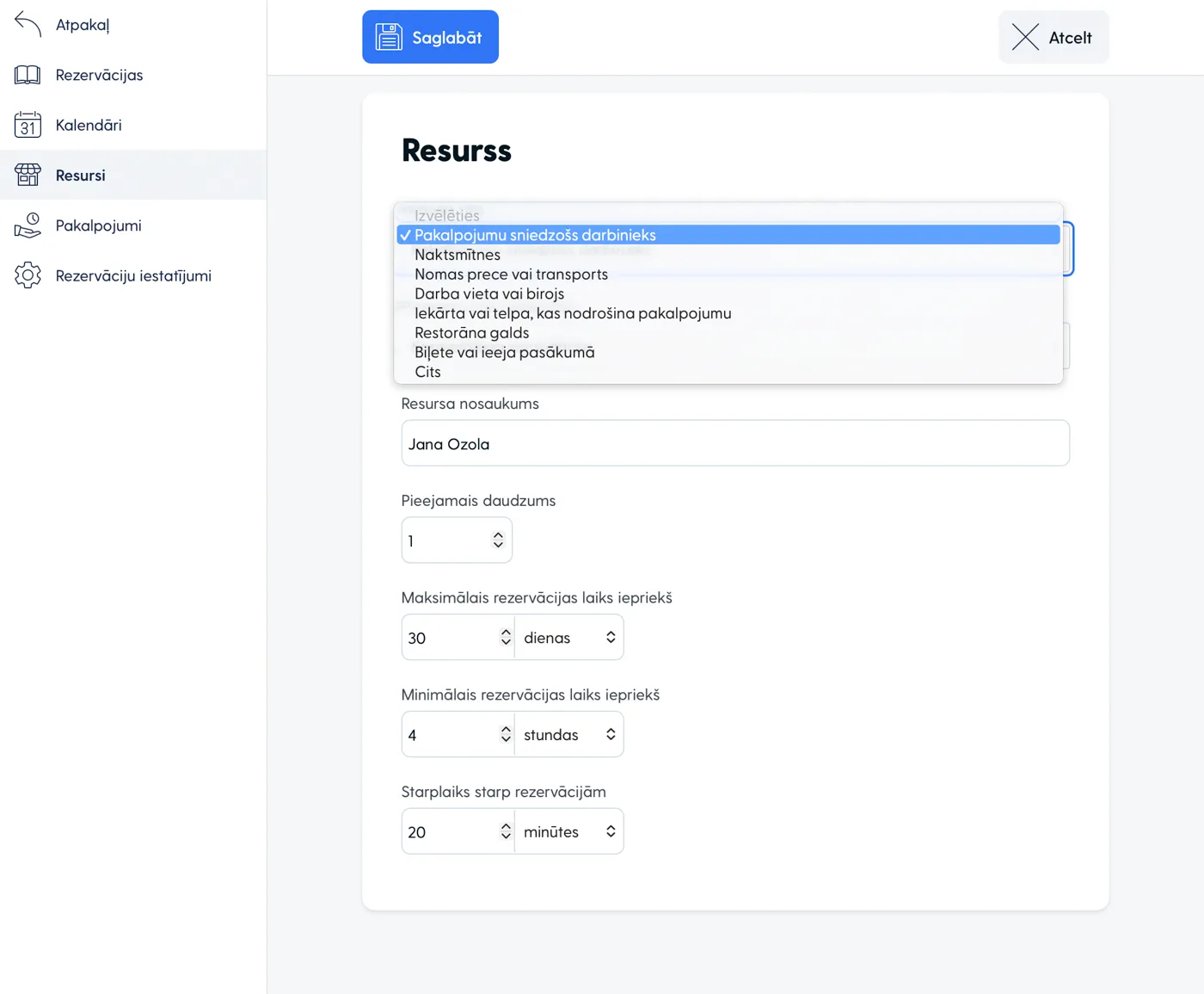 Sistēmai jāsaprot, ko tieši klients rezervē. Resurss var būt darbinieks (piemēram, "Meistare Jana"), konkrēta vieta (piemēram, "Konferenču zāle A") vai aprīkojums. Šeit arī iestati laika buferus – minimālo un maksimālo laiku pirms rezervācijas, kā arī nepieciešamo starplaiku starp tām.