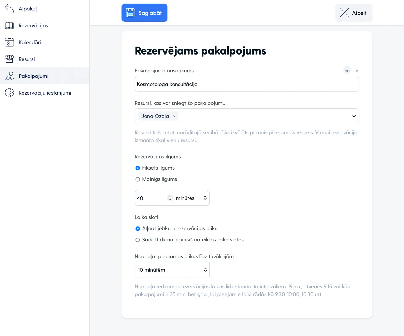 Norādi visus parametrus un izvēlies pakalpojumus, kurus vēlies piedāvāt rezervācijai ar šo konkrēto formu.