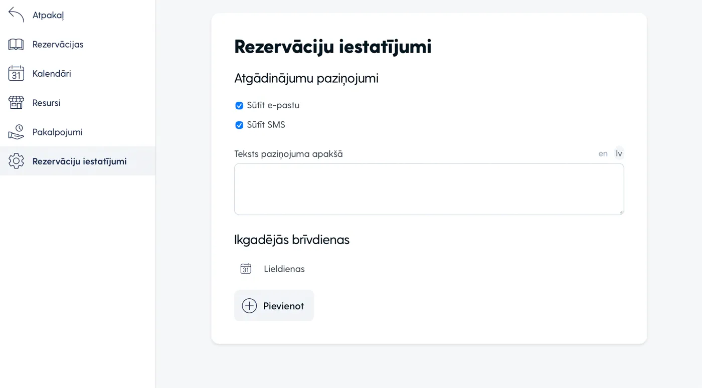 Dodies uz iestatījumiem un izvēlies, kā tavi klienti saņems atgādinājumus par veikto rezervāciju - e-pastā (pieejams visos plānos) vai ar SMS (pieejams tikai Premium Pro plānā). Tu vari pievienot paziņojumiem arī savu tekstu, piemēram, iekļaujot norādes, kā atrast tavu biroju vai ko tieši ņemt līdzi uz vizīti.