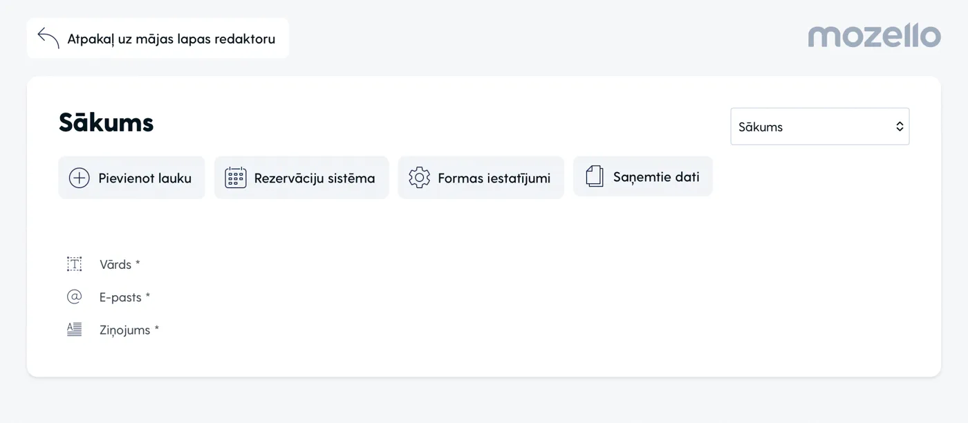 Vispirms izveido jaunu saziņas formu, pievienojot formas satura bloku, vai izvēlies pielāgot jau esošu formu. Ērtības labad ieteicams izveidot atsevišķu formu pieteikumiem, nevis sasaistīt rezervācijas, piemēram, ar jau esošu kontaktu formu.